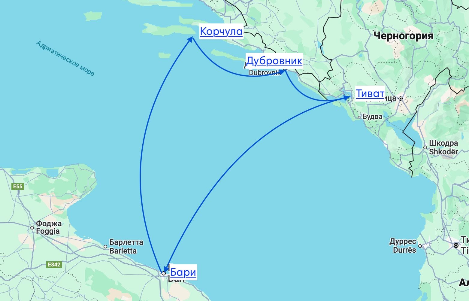 Кальяри - Устика - Мессина - Рипосто - Кротоне - Санта-Мария-ди-Леука - Бриндизи - Тиват
